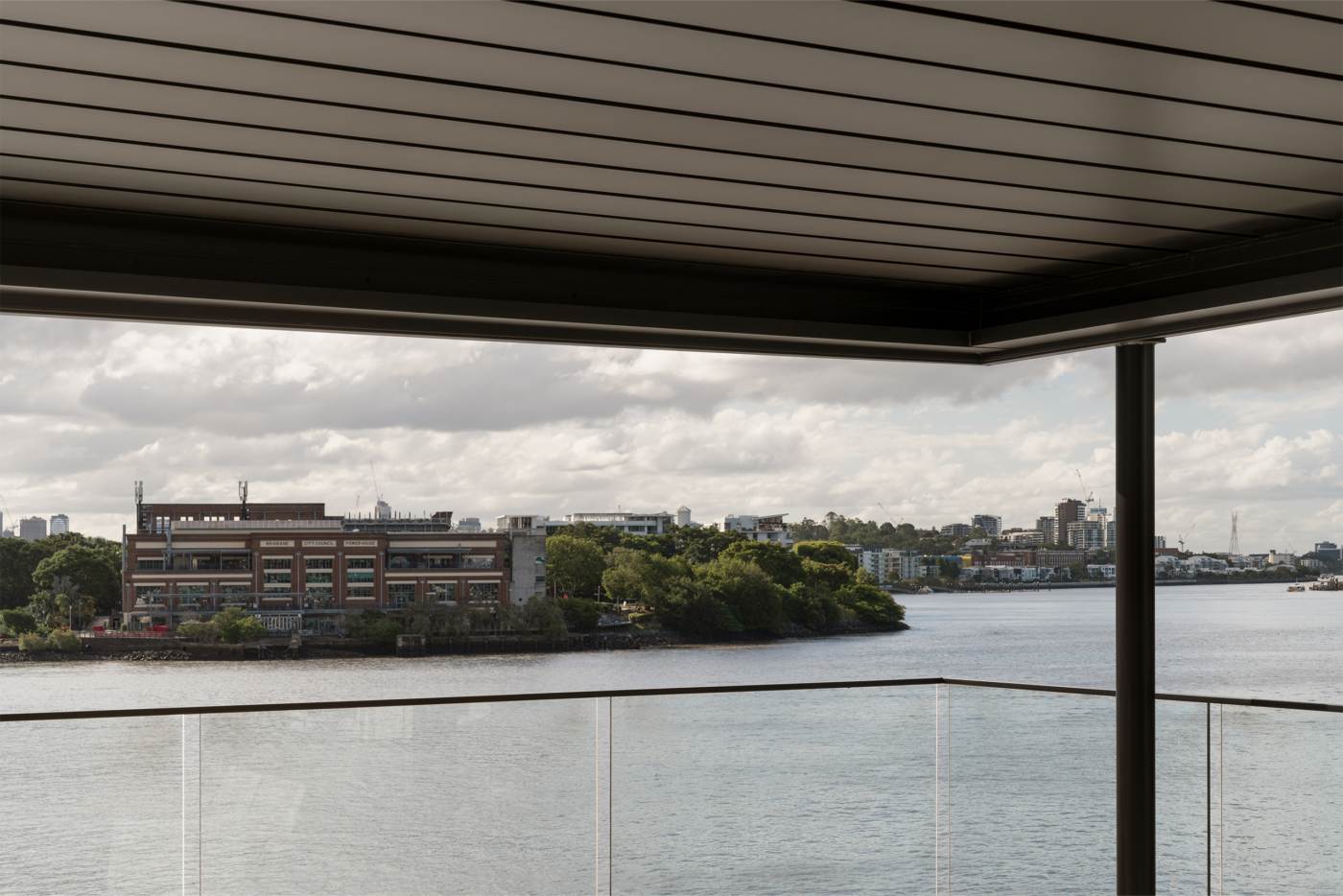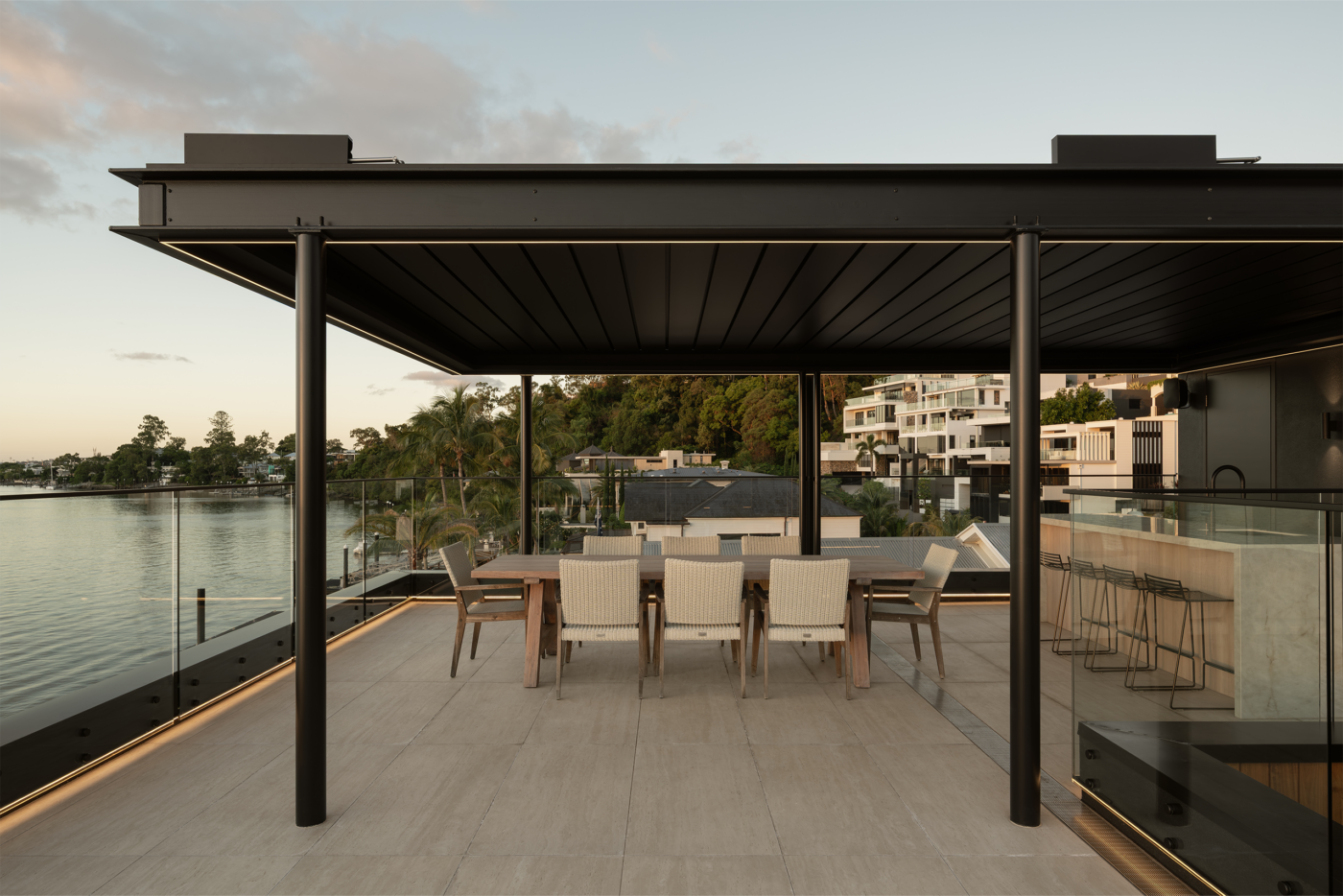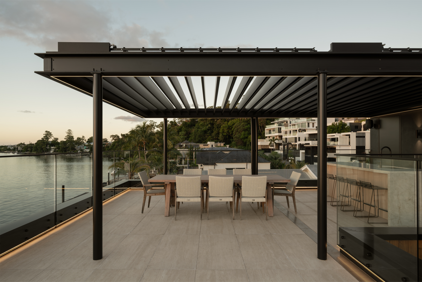 The result is a refined architectural addition that strengthens the home’s relationship with the Brisbane River, delivering a flexible outdoor space that adapts instantly to Brisbane’s variable weather conditions. Whether fully open to the sky, partially angled to filter sunlight, or closed during rainfall, the operable roof ensures the space remains comfortable and usable throughout the year.